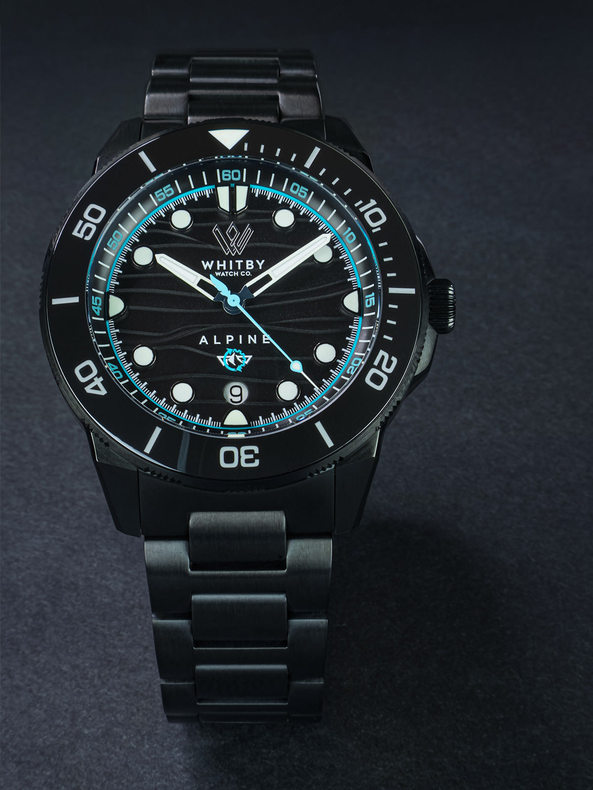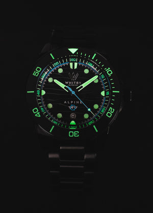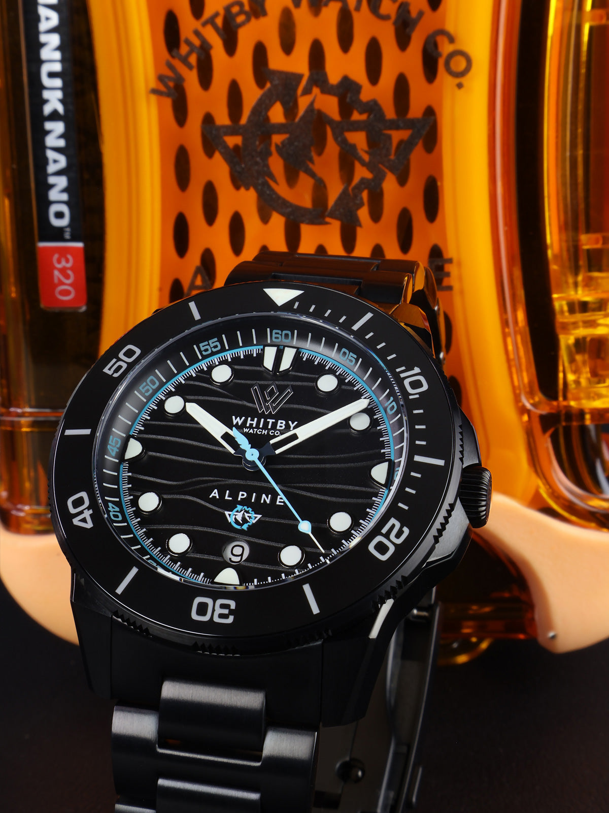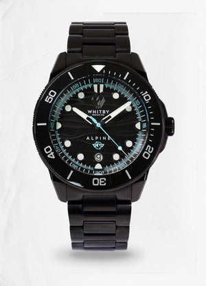 Born from the same spirit that guides the Whitby Alpine line — bridging sea to sky, cliff to compass — the Dark Side Alpine stakes its claim in shadow. This is not merely a blacked-out version of what came before: it is a watch recast for the bold, a nocturnal companion forged for adventure when light fades. Like the original Alpine designs, it channels the rugged geometry of mountain passes and the flow of wild terrain, where curves meet sharp facets. In the Dark Side, those surfaces speak in muted tones, textured depth, and moody contrast.