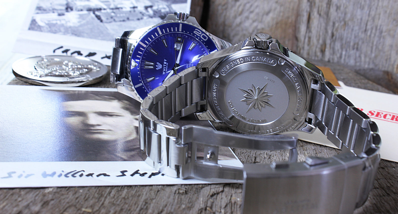 The Intrepid Diver Watch is a Special Edition honouring Sir William Stephenson, "The Man Called Intrepid" for his efforts at Whitby's Camp X, a special military facility for spy training during WWII. Each Watch is Numbered and Limited to 103 pieces!